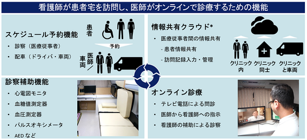 医療機器などを車内に搭載して、医療従事者との連携によってオンライン診療などを行うことができる車両だ。看護師が車両で患者の自宅などを訪問することで、車両内のビデオ通話を通して医師が遠隔地から患者を診察できるようにし、看護師が医師の指示に従って患者の検査や必要な処置を行うことを想定。車両はMONETの配車プラットフォームと連携しているため、効率的なルートで患者の自宅などを訪問することができる。