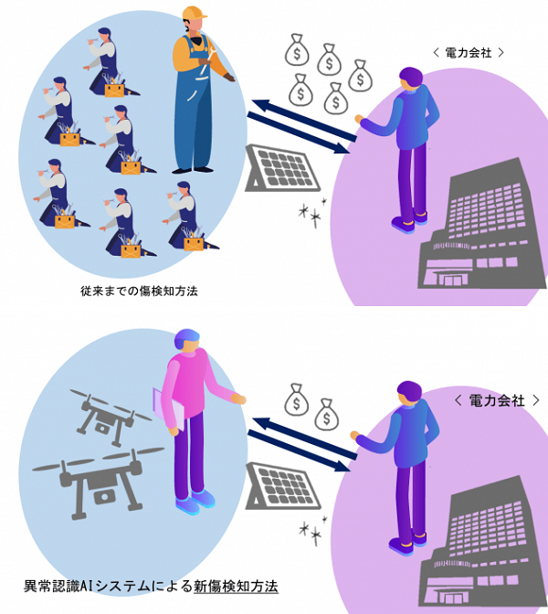 太陽光パネルの故障にはホットスポット(落ち葉などがパネルに付着し、その部分に影が出来てしまった際に、その箇所が発熱する現象)による故障とパネルガラス割れによる故障の2種類が存在するが、パネルガラス割れによる故障は、故障の原因となる傷が極めて微細なため、パネルの亀裂発見は、全て作業員の定期的な点検によるものであった。このような人手による検知方法では、人手不足も深刻化している為、1回の点検に数十万円のコストがかかることが課題となっていたが、同社が2019年9月、発電施設デベロッパー大手と共同で独自の最先端異常検知AI技術を用いた新たなパネル亀裂検知ドローンを世界で初めて開発。