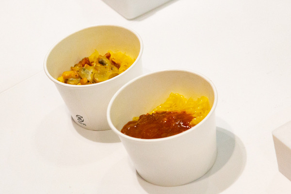 QBIT Roboticsのロボットはこれまで、コーヒーを淹れてくれるロボットで知られてきたが、この時の展示ではロボットがパスタ作りを実演して周囲を驚かせた。パスタの調理は紙カップに乾パスタを入れてお湯とオイルを注ぎ、電子レンジで調理、最後にパスタソースをかけて完成する。パスタソースはカルボナーラとミートソースが選択できるものだった。