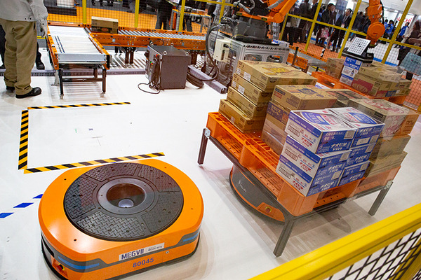 また、今年も目立ったのが、AGV(自動搬送ロボット)。AGVと組み合わせた移動型のロボットアームの展示も多い。
