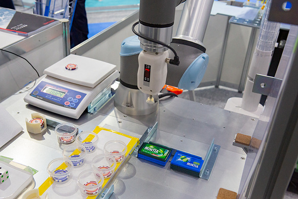 因幡電機産業はUR+とキヤノンのカメラ(ビジョン)システム「VB-H45」を使った協働ロボットを展示。お菓子「ミンティア」の裏面のバーコードをカメラで読んで、商品ごとに並べ替えたり、測りの数字をカメラが読んでロボットに連携するデモなどを展示。