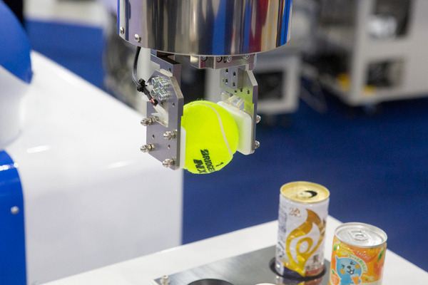 バイナスは豊田合成の「e-Rubber」を使ったロボットアームをデモ。硬いモノをしっかりと、柔らかいモノを優しく持つロボットハンドのデモを公開した。