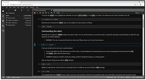 JetBot Megaに搭載されているJetson Nanoでは、通常のCPUに加え強力なGPUが利用可能。同ロボットでは、JetBotプロジェクトで用いられているWebブラウザベースのプログラム環境Jupyter Notebookや、公式のサンプルソースなども利用できるため、いわゆるモダンAIと呼ばれるような技術を体感、実装する用途に適している。