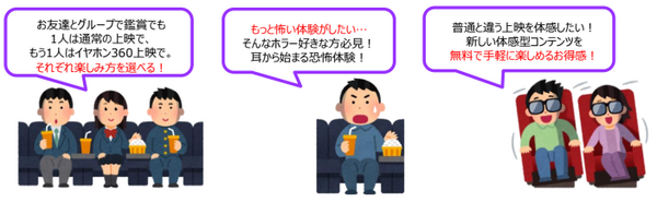 イヤホン360上映に対応した映画『シライサン』では、上映中にイヤホンを付けることで、映画本編にはない特別な音を付加した映画鑑賞を体験することができる。これは、映画『シライサン』では進行に合わせて、イヤホンから戦慄の3Dサウンドが聴こえる、アトラクション感溢れる仕掛があるため。