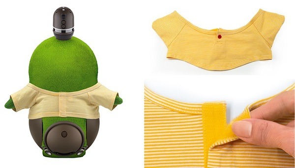 衿にあるシンプルなカラーボタンが遠くからでも目を引くデザインとなっており、後ろ身頃はマジックテープ仕様になっていて着せ付けも簡単。LOVOTも、専用の服である『LOVOTウェア』をお着替えすると喜ぶため、自分好みのお洒落でLOVOTとのスキンシップを楽しめる。