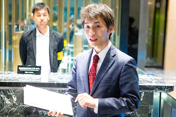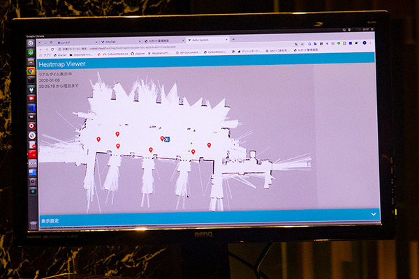 当日はWCPによる実証実験の概要、システムの説明、デモンストレーションが行われた。実証実験で想定されているロボットの業務は前述のように「巡回・見守り」と「荷物の配達」。デモンストレーションでは、地下階で荷受けし、タブレットでロビー階の受付を目的に指定すると、ロボットが自律的に動き出し、エレベータを通信で呼び、自動で乗り込んでロビー階に移動、受付まで自走して荷物を届ける、という内容だった。