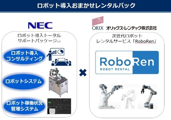 オリックス・レンテックと、日本電気(以下、NEC)およびNECプラットフォームズは、企業におけるロボット導入を支援するため、ロボットシステムインテグレータ事業で協業することについて合意したことを発表した。生産ラインでのロボットの利活用を促進することで、日本国内の人材不足の解消や生産性向上などの課題解決を目指す。