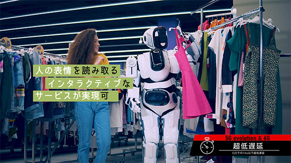 サイバー・フィジカル融合において、AIとデバイスをつなぐ無線通信は、人間で例えると情報伝達をする神経に相当すると言え、リアルタイムかつインタラクティブなAIによるサービスをより高度に実現するには、常時安定したE2E(End to End)での低遅延性が基本的な要件になると考えられる。6Gに向けて、具体的にはE2Eで1ms以下程度が目標値として考えられる。これによって例えば、ロボティクスによる店舗無人化において、お客様の表情を見て人間のように気の利く対応するようなインタラクティブな遠隔ロボット接客が実現できるかもしれない。
