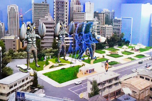 また、来場者の3Dデータをリアルタイムで仮想空間の中に転送する技術も使われている。ここでは科特隊(ぽい)コスチュームを着たMCの人が街中のビルの屋上に転送されている。