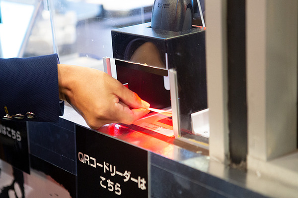 購入したチケットをコードリーダーにスキャンする(一度スキャンしてロボットに注文が通るとコードは無効になる)。