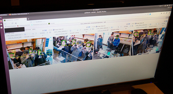 QBITの接客ロボットサービスで、エンタメ機能としてポイントとなるのは、顧客の動きや表情を読んで、その反応から接客に適した会話を学習していく点だ。ロボットの上部には左右4つのカメラが設置され、性別や年齢層など顧客の属性を解析する。