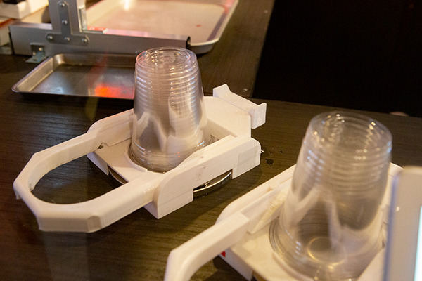 手に持ったコップで押して、注文のあった商品をサーバから注ぐ