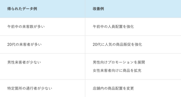 カメラで取得したデータを活用することでメインターゲット層を変更したり、商品の陳列を変えたり、客層にあったプロモーション展開が可能となる。