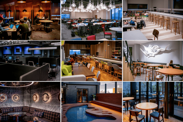 コワーキングスペースの活用により、スタッフは仕事の内容・気分・時間にあわせて自由に多彩多様なフロア(地下1Fから9Fまで)の中から好きな席を選んで仕事をすることができる。各フロアにはフリードリンクコーナーが充実しており、近日中には入居者専用のカフェテリアもオープン予定となっている。