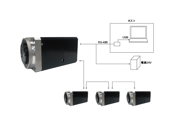 ・製品と電源24V(DC24V)、ホスト(パソコン)を接続するだけのシンプルな構成。