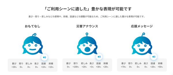 コエは喜び・怒り・悲しみなどの感情や、抑揚、話速などを調整することで、来客時の対応、災害アナウンス、応援メッセージなど利用シーンに適した豊かな表現が可能。