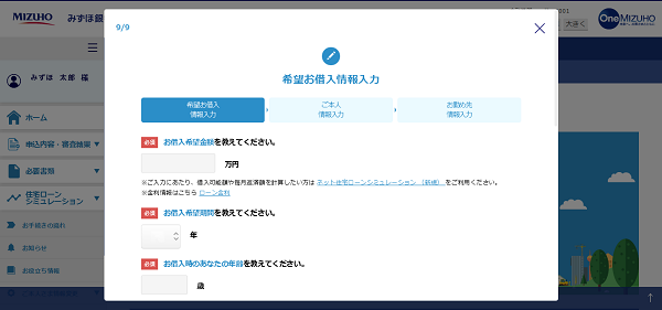 | 申込ボードの登録 | 初めて「みずほ A I 事前診断」を利用する人を対象に、申込ボードの登録をする。 各ページの「お申込」ボタンもしくは「AI事前診断」のボタンをクリックまたはタップして進む。 ※新規借入れと借換えで、登録フォームが異なる |