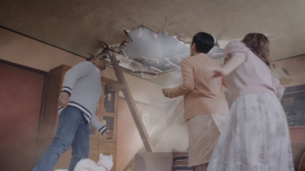 いつものようにリビングでくつろぐ白戸家の面々。5Gについてアヤ(上戸さん)が「できたらいいね、ができちゃうの。ドラえもんみたいに。」と話すと、すぐさまお父さんが「ドラえもんなんているわけない」と否定した、その瞬間、「ドカーン!」と言う大きな音とともに、屋根を突き破って、青いパーカーの男が落下。彼は、白戸家の隣に引っ越してきたドラえもんだったのです!