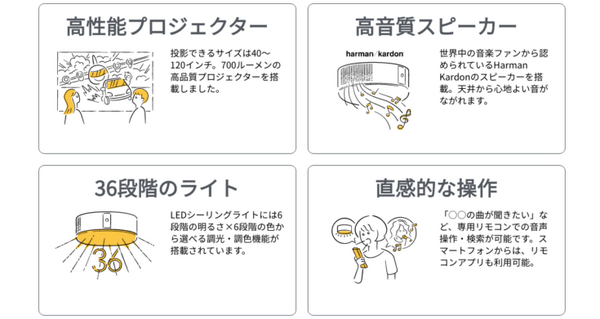 「popIn Aladdin」は寝室に画面のある暮らしをコンセプトに、シーリングライトに、700ルーメン(明るさ)の高性能プロジェクターと、Harman Kardonの高性能スピーカーを搭載。家庭用の引掛シーリングがあれば、追加工事は不要で、誰でも簡単に取り付けることができる。LEDシーリングライトには6段階の明るさ×6段階の色から選べる調光・調色機能が搭載。プロジェクターで投影できるサイズは40~120インチ。