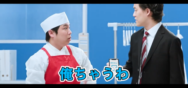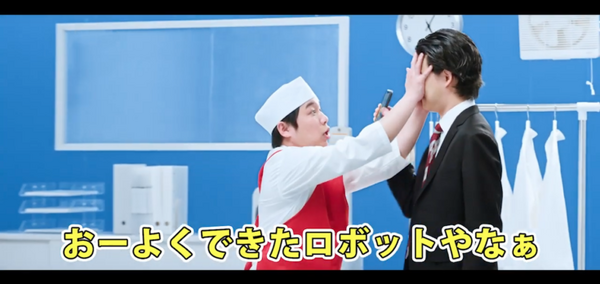「コボット?ロボット?」篇は店長役のせいやさん、本社の人役の粗品さんの掛け合いです。
