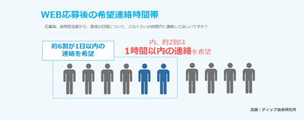 ディップが実施したアンケート調査によると、求職者の6割が「1日以内」その内の2割は「1時間以内」の連絡を希望し、即時対応を望むユーザーが増えている。しかし、約半数の応募が18時~朝7時と対応困難時間帯に集中しているため、求職者の求める即時対応が難しく、求人企業の多くが求職者の取り逃がしの課題を抱えている。