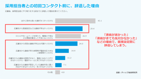 同時に「応募後、採用担当者とやり取りをする前に辞退した理由」について聞いたところ、「面接設定の連絡が来なかった」「電話に出ることができなかった」等、初回の対応方法が起因し、面接を辞退してしまう求職者が多い実態が分かった。