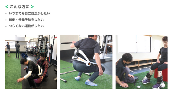 身体の一部に障がいのある人、脳梗塞、脊髄損傷などの後遺症でリハビリを受けたい人向けのプログラム。脳卒中や脊髄損傷の後遺症により、自力で立つ・歩くなどの運動が困難になった方の身体機能の改善を目指す。また、従来のリハビリで効果を感じなくなってしまった人にも、更なる改善が期待できる。