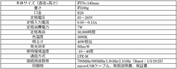 「HelloLight」の特徴は、IoT電球り内部にあるLED基板とSIMが一体化していること。接続するだけでSIMを通じて通信が行えるため、Wi-Fiが不要。通信には広域を低コストでカバーできるLPWA(Low Power Wide Area)規格を採用している。LED電球としては一般的なE26口金を採用しており、40W相当の明るさを実現。通常の電球と同様に特別な工事を必要としない。
