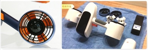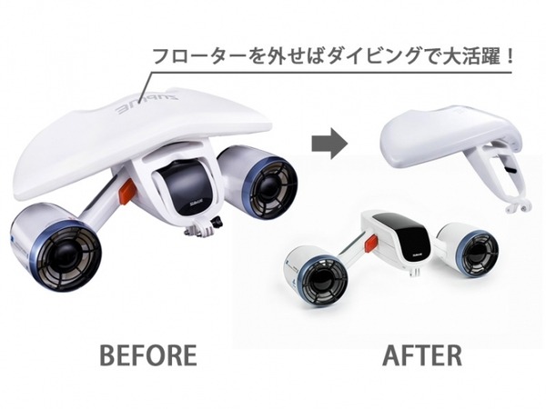 取り外し可能なフローター装着時は手を離しても沈むことはなく、スクリュー部分には指や異物の流入を防ぐガードを搭載した安全設計。メンテナンス方法も一般的なマリングッズと同様で使用後に真水で洗浄して乾燥させるだけなため特別なコストは掛からない。
