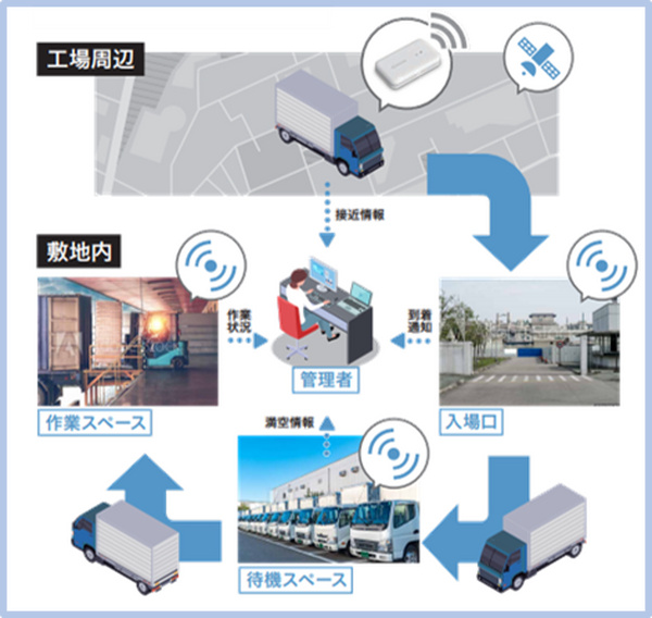 工場への接近をGPS、到着をビーコンで検知。待機スペースや作業スペースなど敷地内でのトラックの所在を把握することができ、工場内の管理者は敷地内の安全管理や作業の効率化が、トラックドライバーは待ち時間の削減が期待できる。