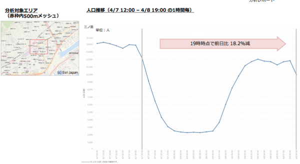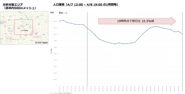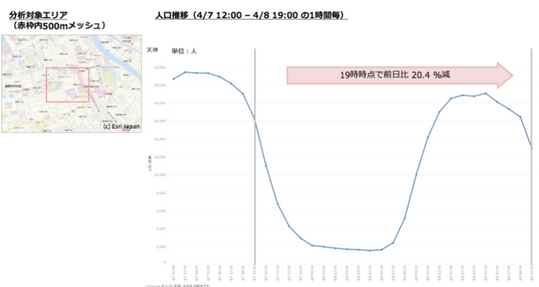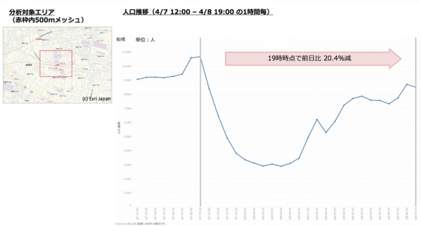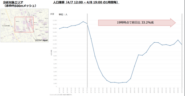 集計したデータは4月7日12時~4月8日19時までの1時間ごとの情報。対象エリアは渋谷(東京都)、横浜・川崎(神奈川県)、千葉・船橋(千葉県)、浦和・大宮(埼玉県)、梅田・難波(大阪府)、三ノ宮(兵庫県)、天神(福岡県)の7都府県。