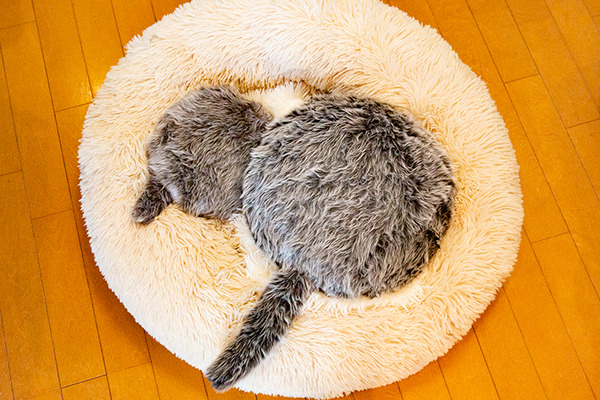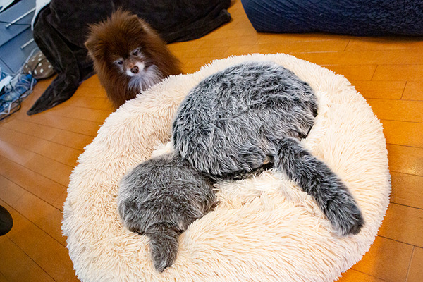 そんなクーボに新しい仲間が加わりました。名前は「Petit Qoobo」(プチ・クーボ)。パッと見た目はまるでクーボの子ども。身体も尻尾も小っちゃくて可愛いんです。あんまり可愛いので、いつもは犬が寝ているベッドを拝借して写真をパチリ。