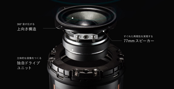 BALMUDA The Speakerは全音域をシームレスに再生する直径77mmのフルレンジスピーカーと独自設計のドライブユニットにより、曲本来のバランスはそのままに、ボーカルが目の前で歌っているかのような音像を実現。スピーカーを上向きに設置したユニークな構造のため音が上方向に拡散し、360°どこでも同じ音楽体験が可能、とする。