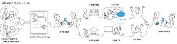 CHEERPHONEはマイク機能を有する親機とスピーカー機能と発光機能(LED)を有する子機のデバイスにて構成される。親機にて入力された音声が離れている子機へ届けられ、発光しながら音声を再生する。これにより離れていても声援を届けることができる