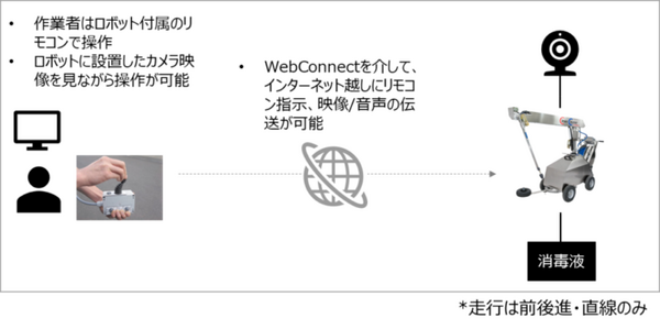株式会社中嶋製作所が取り扱う畜舎向け洗浄ロボット「クレバークリーナー」を消毒液無人散布作業向けにカスタマイズ。アスラテックが保有する遠隔化技術「V-Sido WebConnect」を用いる。このロボットを離れた安全な場所から操作し消毒作業などに活用できる。