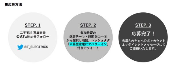 参加費は無料。あらかじめ用意した4つのテーマで、合計8名の一般ユーザーを蔦屋家電に招待する。当日の参加はパソコンからのみ(スマートフォンでの参加は不可)となる。応募方法は二子玉川 蔦屋家電Twitterアカウントをフォロー。所定のハッシュタグをつけて応募するとともにavatarinの会員登録を行う。募集期間は2020年4月24日~4月27日(月)。