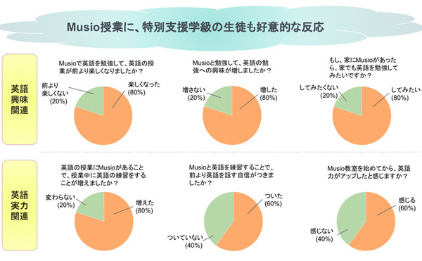 自立活動においてはMusioを通じて英語が好きになった生徒の自己学習ツールとして活用することで学習を深め、場面緘黙症の生徒にとっては安心して話せる発語の練習相手としての活用ができることも分かった。さらに、実証実験終了時に行った生徒へのアンケートの結果から、過半数以上の生徒がMusioを活用した英語に対して好感を抱き、学習に前向きに取り組むようになったことが分かる。