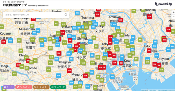 株式会社unerryは新型コロナウイルスの感染拡大防止に寄与することを目的として、全国約2.8万店のスーパーやドラッグストア等のお店及びその周辺の曜日・時間帯別混雑傾向が調べられる無料サイト「お買物混雑マップ Powered by Beacon Bank」(以下、お買物混雑マップ)を公開することを発表した。