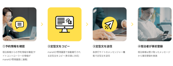 オーナーは予約情報を確認し、定型文をコピーして送信するだけ。宿泊者は受け取ったメッセージから事前登録を行い、発行されたQRコードを受付のmaneKEY端末にかざしてチェックインできる。チェックインの際はAIが本人確認を実施する。ニーズに合わせたカスタマイズにも柔軟に対応でき、スマートロックと連携すると、ルームキーの受け渡しの作業も省力化できる。