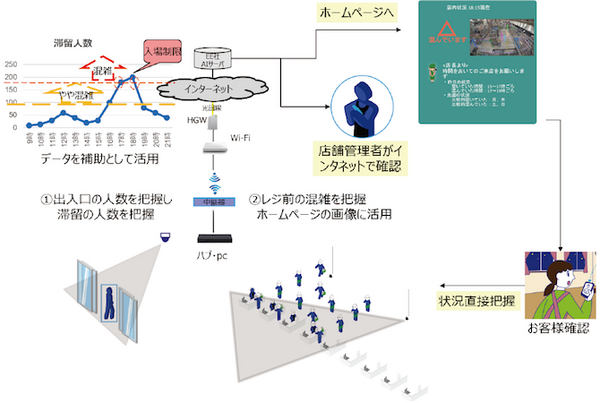 300坪程度の小売店などの場合、メイン通路の3カ所程度に「ソーシャルディスタンスカメラ」を設置する。各カメラが検知する人と人の間隔のデータをAIで解析し、ホームページや施設責任者のスマホに密集レベルを通知。利用者は、ホームページの画像などを見ることで混雑状況を把握できる。また、出入口人数カウントカメラなどと連動させることで、混雑時間などを予測することも可能。