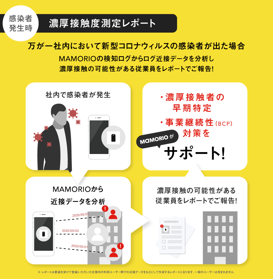 「濃厚接触度測定レポート機能」は、前述のディスタンスレベル機能を応用し社内の従業員間における濃厚接触者の特定をサポートするオプションサービス。通常時は企業で従業員の入館証やIDカードの紛失防止対策として使用し、万が一社内において新型コロナウィルスの感染者が出た場合は利用企業社の承諾のもと、これらMAMORIOの過去の検知情報から社内間での詳細なすれ違い情報を分析し、患者が発症する二日前から社内で患者と近接した可能性が高い従業員データを速やかに分析・レポート形式で担当者に提出する。