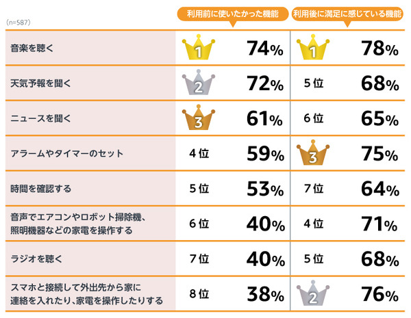 一方で、利用後に満足に感じている機能は音楽を聴く(78%)、スマホと接続して外出先から操作(76%)、アラームやタイマーの設定(75%)、音声による家電の操作(71%)、ラジオを聴く(68%)といった機能が挙げられた。また、利用前の期待度はさほど高くなかったものの利用後に満足度が高かった機能には、お気に入り写真を投影(67%)、ビデオ通話を利用(65%)、音声操作でネットショッピング(58%)なども挙げられた。