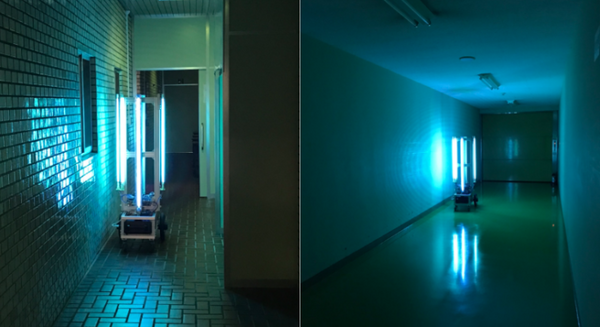 紫外線照射ロボット「UVBuster」に搭載している中出力UV-Cランプの照度(3.35mJ/㎠)の場合、10cmの距離からインフルエンザウイルスに照射すると、2.46秒で99.99%が不活性するという。「COVID-19」には効果があるのか、実証実験が行われた。