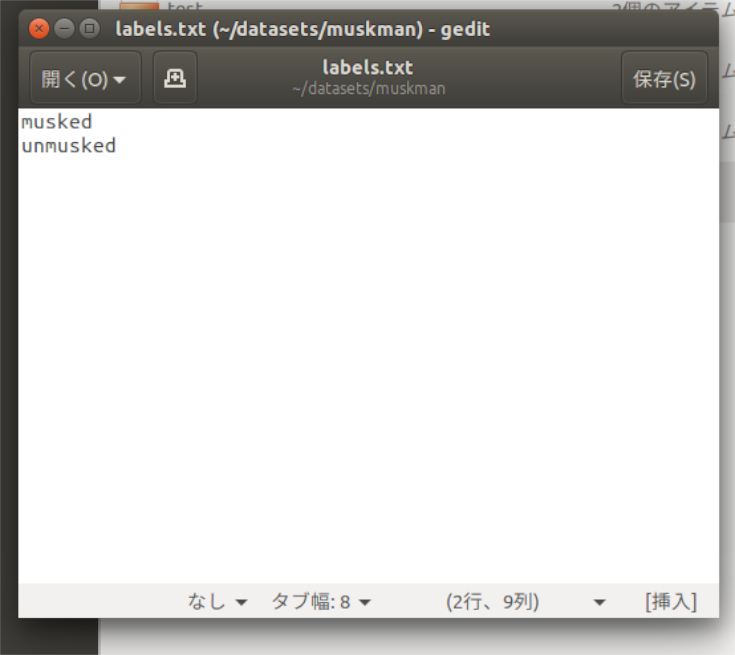 Labels.txtの中身はこんな感じで、「musked」「unmusked」と書いた2行のテキストファイルになります。