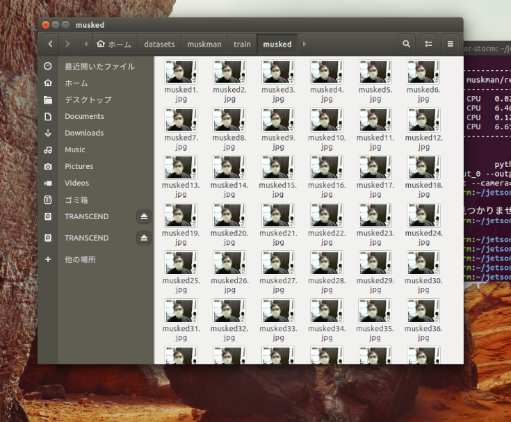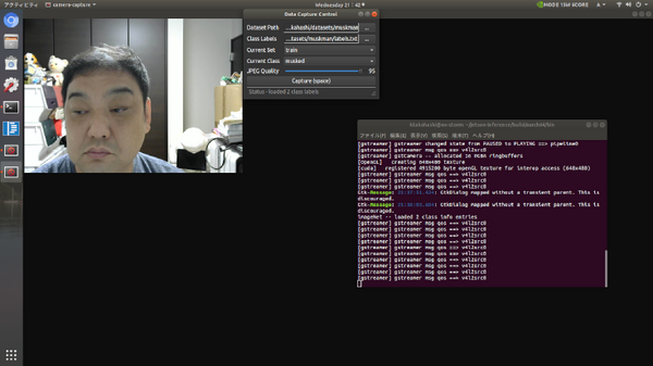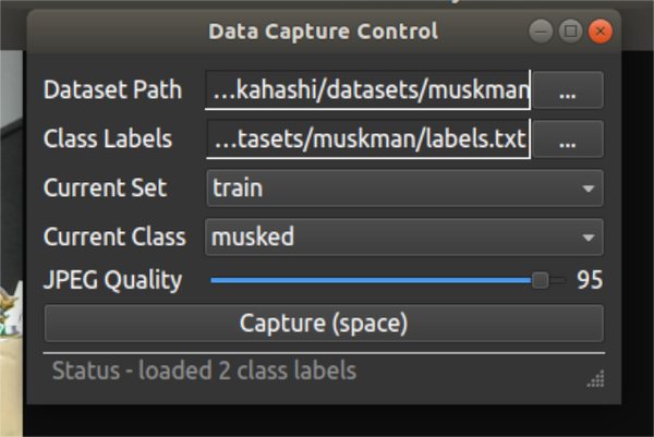 Data Capture ControlというウインドウにDataset PathとClass Labelsのフィールドにすれぞれ~/datasets/muskmanとlabels.txtを選択すると、Current SetとCurrent Classを切り替えながらスペースキーを押していくとjpeg画像が保存されていきます。