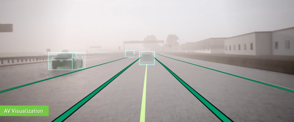 それを受けて、NVIDIAはコンテンツ作成パイプラインを開発し、NVIDIA Omniverseコラボレーションプラットフォームを使ってきわめて正確な3D環境を生成。この環境には道路網や路面標示も正確に表現されており、物理世界の本物のセンサーと同様に光線、電波、ライダーの光との相互作用が起こるように、マテリアルのプロパティも適用されている。