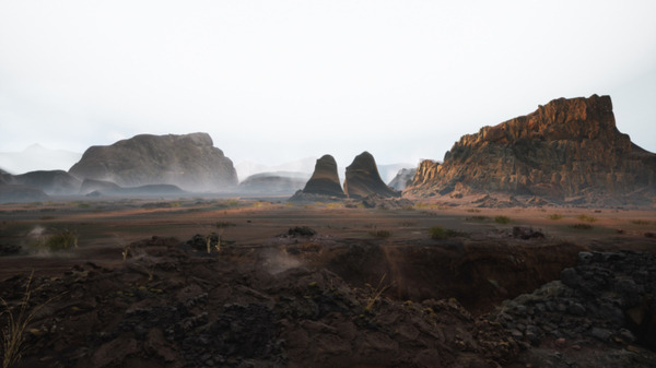 バーチャル展示場でカスタマイズしたデザインのまま、Megascansによる美麗グラフィックスの荒野を走行する。