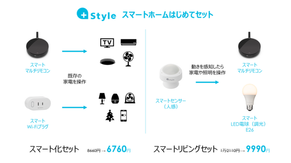 目玉となるのは「スマートマルチリモコン」で既存家電をかんたんにスマート化できる「スマート化セット」とリビングの主な家電をスマートホーム化できる「スマートリビングセット」。