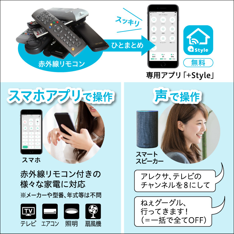「スマートマルチリモコン」は赤外線リモコン付きのテレビやエアコンなどの家電をスマートフォンアプリ「+Style」から操作できる。GoogleアシスタントとAmazon Alexaにも対応しているため、スマートスピーカーを使っての音声操作も可能。