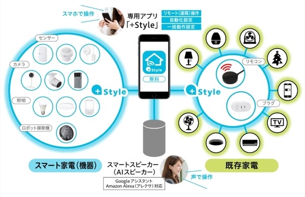 「あらゆる人に、ちょうどいい」をコンセプトとした+Styleのスマートホーム製品は、スマートフォンアプリ「+Style」やスマートスピーカーと連携することが可能。アプリでは電源ON/OFFやタイマー設定などの操作が可能なほか、+Styleの各種センサー機器と連携して家電が自動的に動くように設定できる。また、いま自宅にあるテレビやエアコン、扇風機がアプリ操作可能になるリモコンやプラグと組み合わせることで、家中の家電をアプリやスマートスピーカーでコントロールできる。